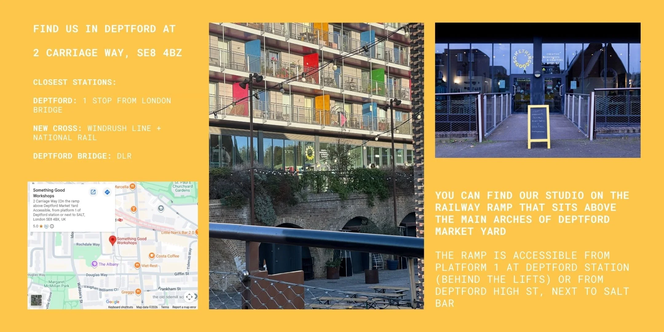 We’re on a grade II listed railway ramp that is accessible from platform 1 of Deptford station (behind the lifts) or up from Deptford High St next to SALT bar, that floats above the arches of Deptford Market Yard and under a very colourful flat block.