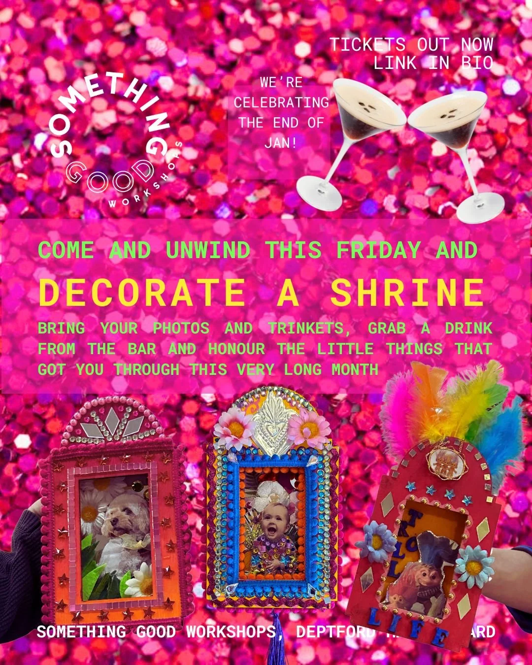 Inspired by traditional devotional folk art - in this joyful workshop, you'll create your own colourful, meaningful shadow box shrine that celebrates someone or something close to your heart. Perfect for anyone seeking a creative way to honour special memories or important aspects of their life, you'll transform a simple wooden shrine into a personal treasure using an array of beautiful materials.Working in a supportive, playful atmosphere, you'll get to combine various decorative elements to tell your unique story. Whether you're creating a tribute to your best friend, a beloved pet, or maybe even your favourite celeb, you'll be guided through techniques that will help bring your vision to life.Bring along your own photos, or print them at our studio to create a beautiful memory box packed with personality. Play with patterns, textures and 3D elements to create your own piece of unique wall or shelf art.Surrounded by an abundance of inspiring materials - from shimmering mirror tiles and sparkling gems to rich paints and luxurious trims - you'll have everything needed to create something truly special. No artistic experience is necessary; this activity is all about expressing yourself and celebrating your memories through colour, texture, and meaningful decoration.You'll walk away with your own vibrant photo shrine that you can display proudly - a daily reminder of what matters most to you!