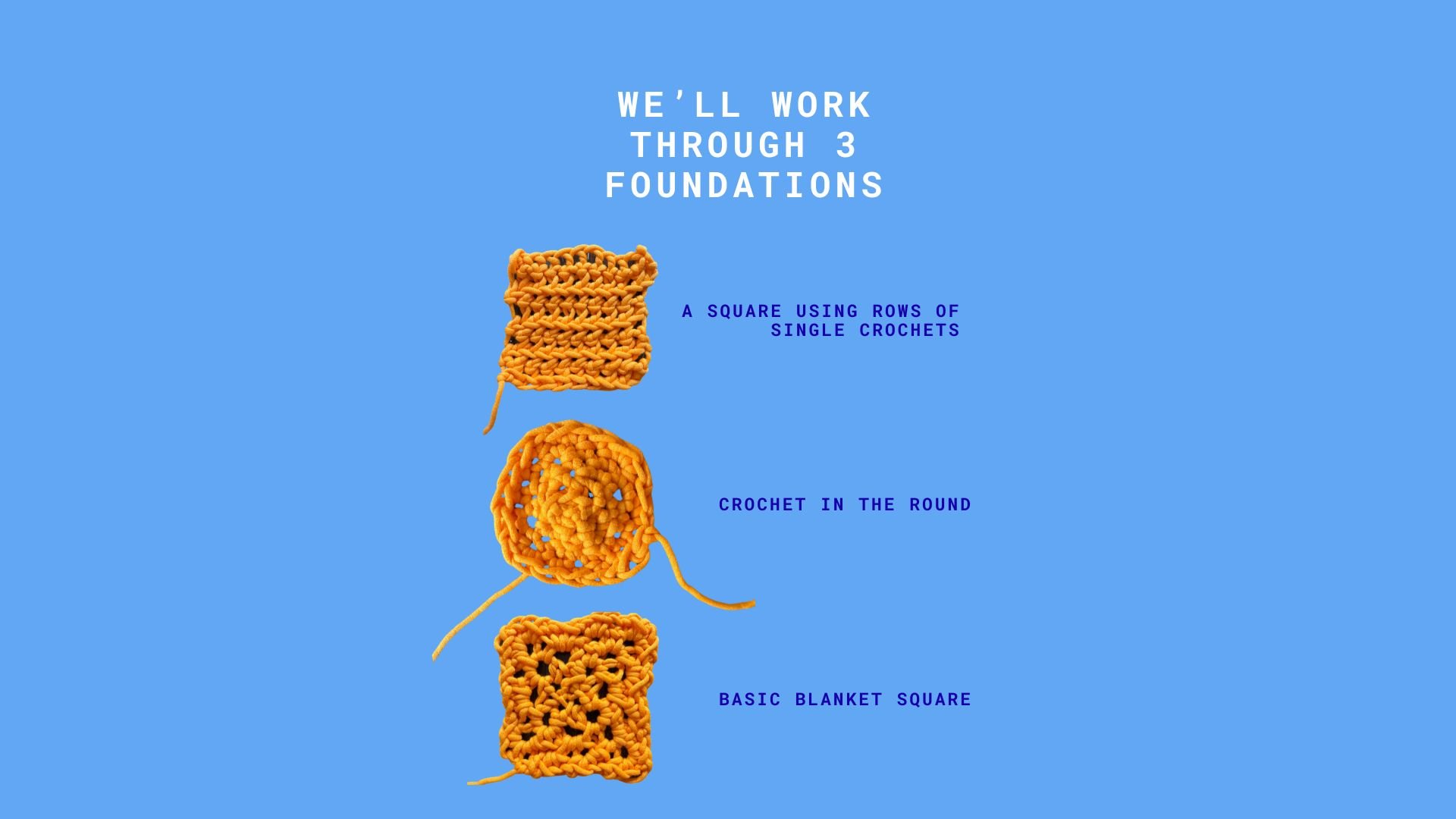Throughout the session, you'll learn the foundational stitches of crochet and use them to create three samples:
