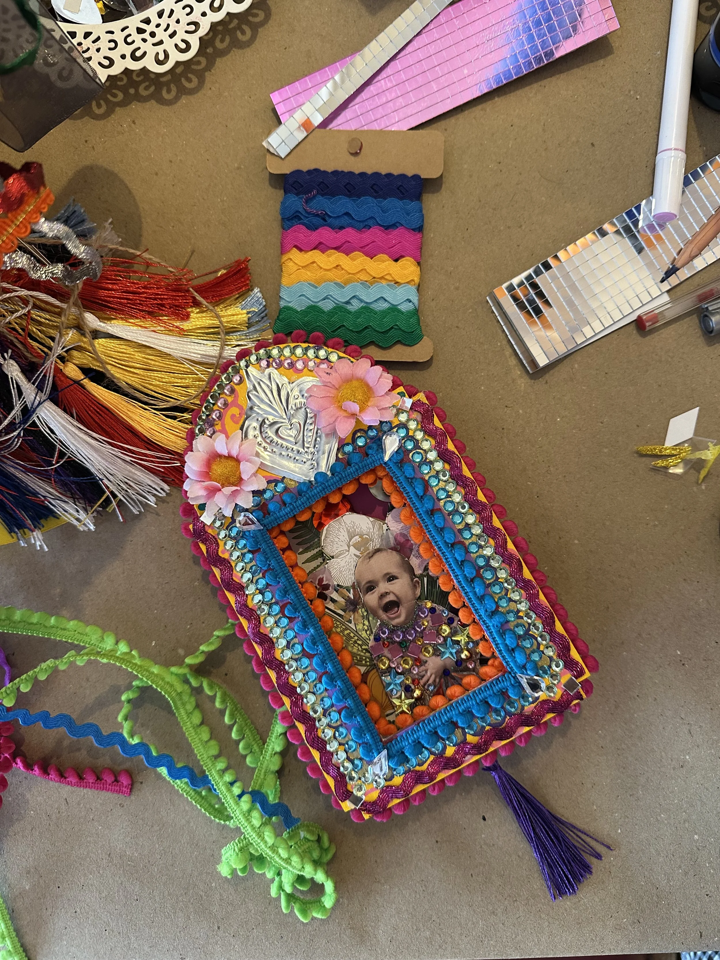 Inspired by traditional devotional folk art - in this joyful workshop, you'll create your own colourful, meaningful shadow box shrine that celebrates someone or something close to your heart. Perfect for anyone seeking a creative way to honour special memories or important aspects of their life, you'll transform a simple wooden shrine into a personal treasure using an array of beautiful materials.