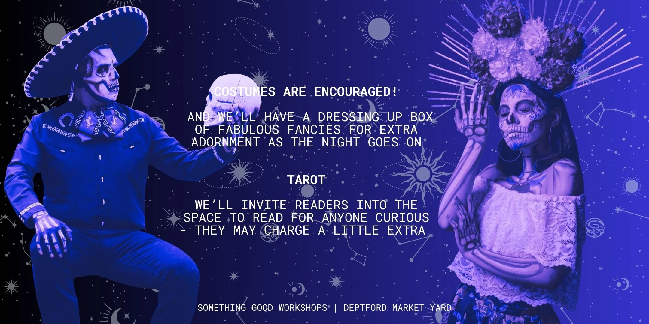 We’ll provide all the materials and props you need to play, create and celebrate. Costumes are encouraged – and our dressing-up box will be on hand for extra flourishes throughout the night. Tarot readers will also be in the room, ready for anyone curious enough to seek a little insight (they may charge a little extra).