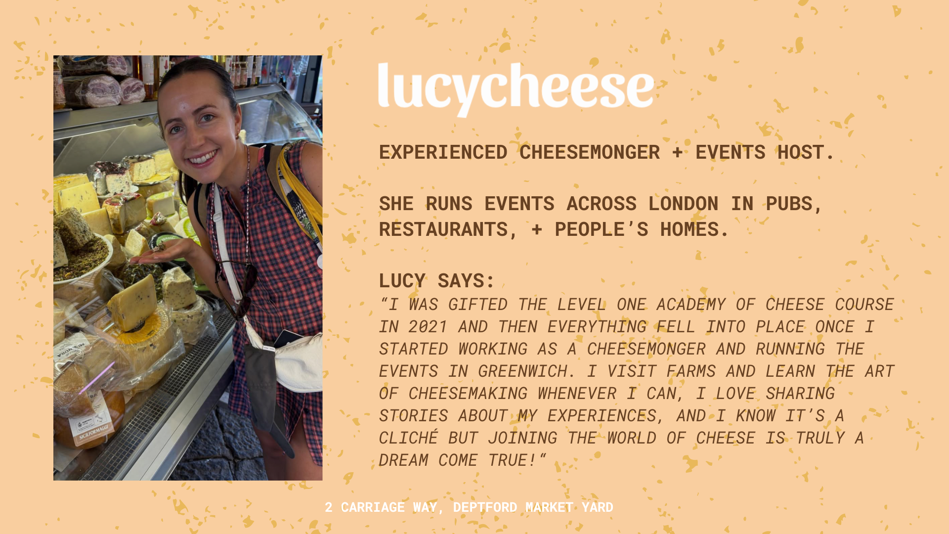This session is led by Lucy, cheesemonger at The Cheeseboard in Greenwich and finalist at the Young Cheesemonger of the Year. She has chosen a delicious range of cheeses especially for this event, each paired with soft, playful drinks ideal for daytime tasting.