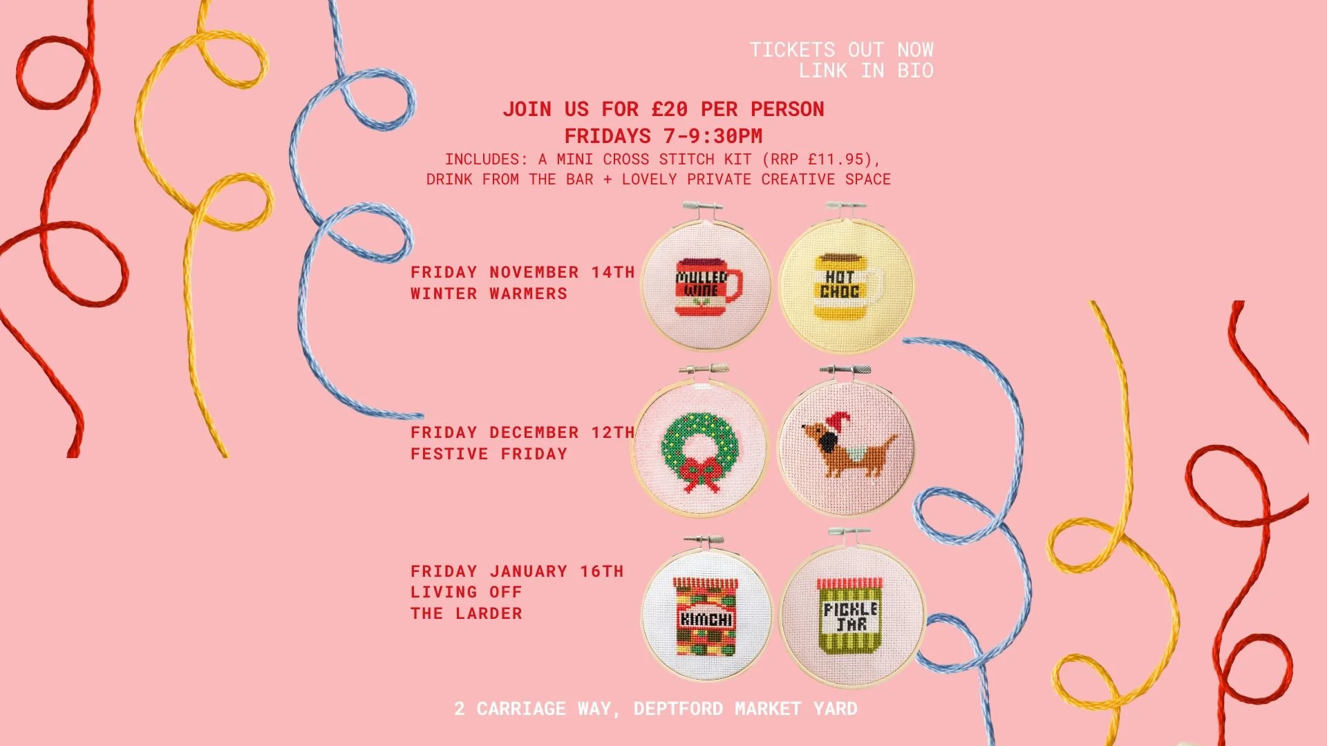 Ease into your weekend with Sip & Cross Stitch, a relaxing Friday night workshop at Something Good Workshops in Deptford Market Yard.