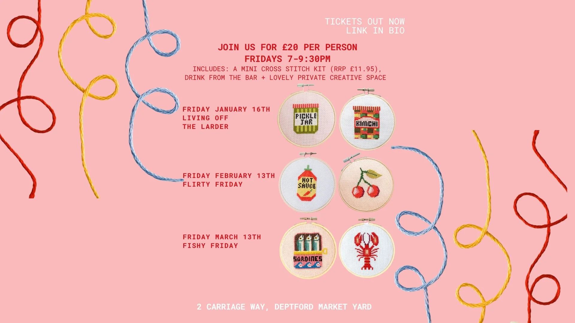 Ease into your weekend with Sip & Cross Stitch, a relaxing Friday night workshop at Something Good Workshops in Deptford Market Yard.