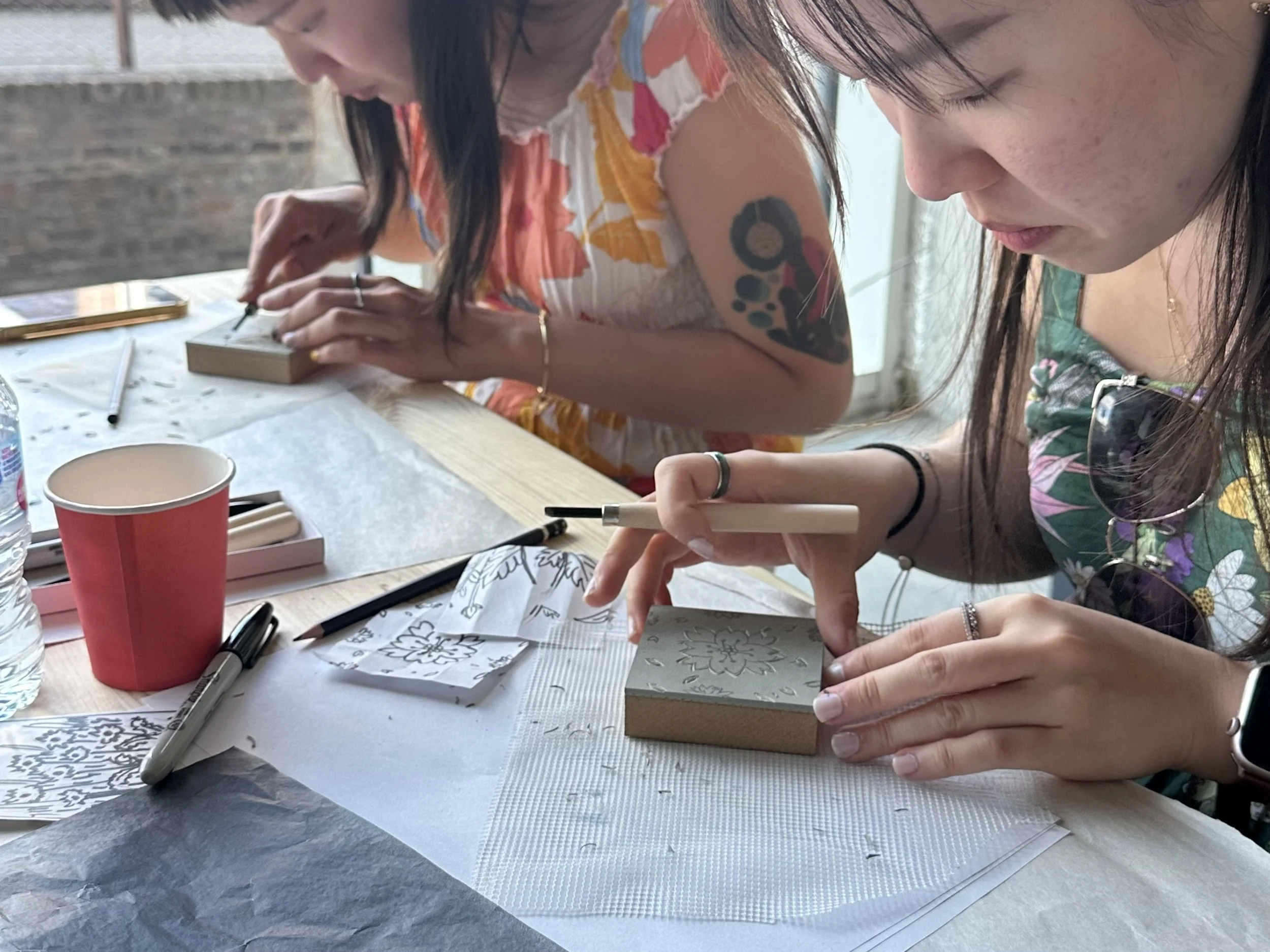 Design, carve and print lino blocks. Perfect for beginners to printing, leave this workshop with your very own stamp. At parties - create a whole set to share and print with your group