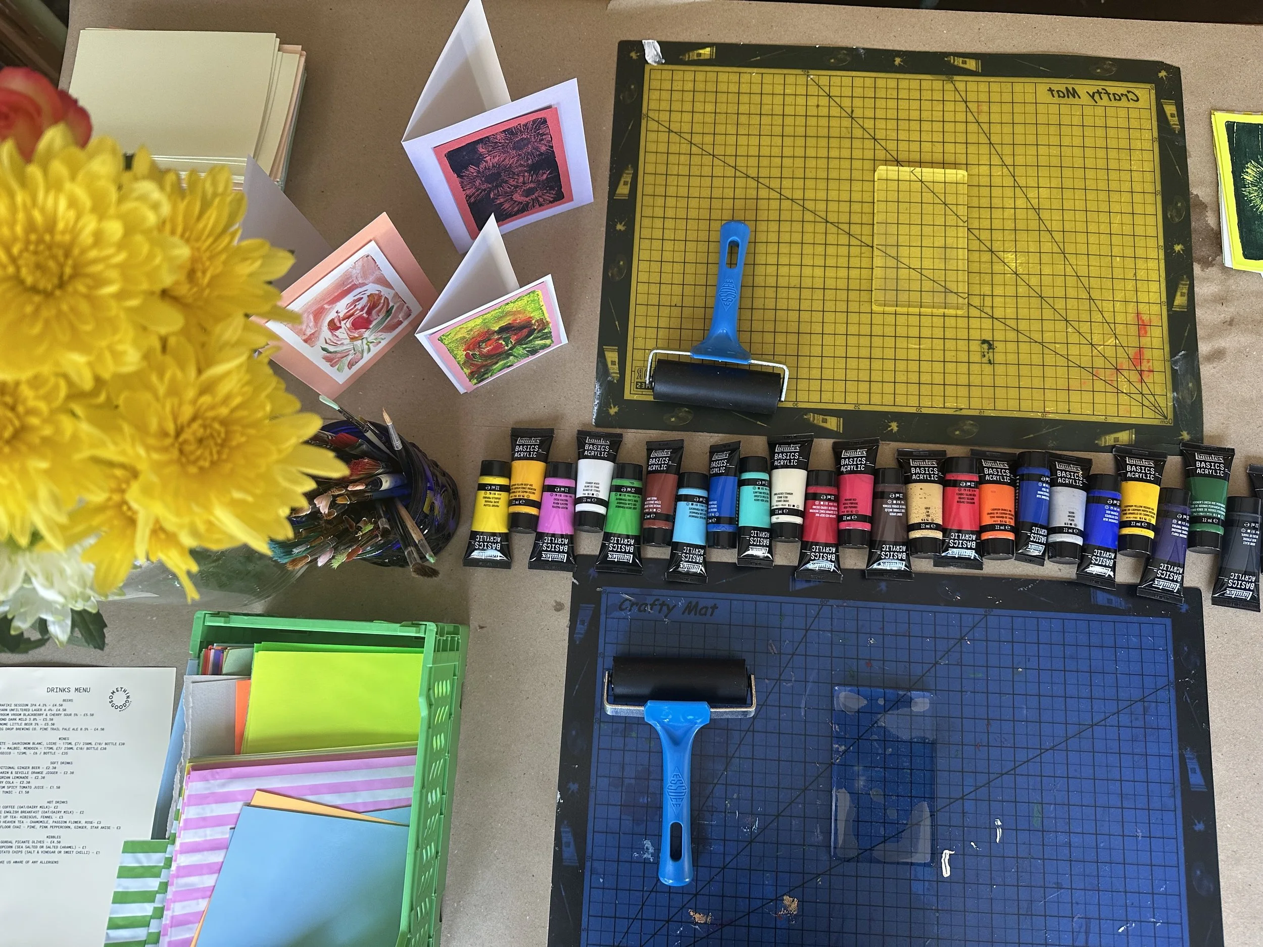 Join us in Deptford for a joyful, beginner-friendly printmaking workshop using gelli plates, fresh flowers, and vibrant paints to create your own set of handmade greeting cards.